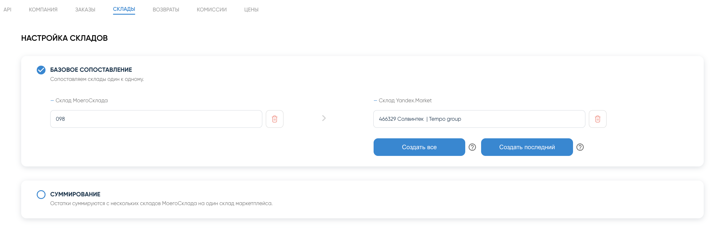 Суммирование – один склад Яндекс Маркета связан с несколькими складами МоегоСклада. Выбор приоритетного склада обязателен и должен дублировать один из складов в сопоставлении.