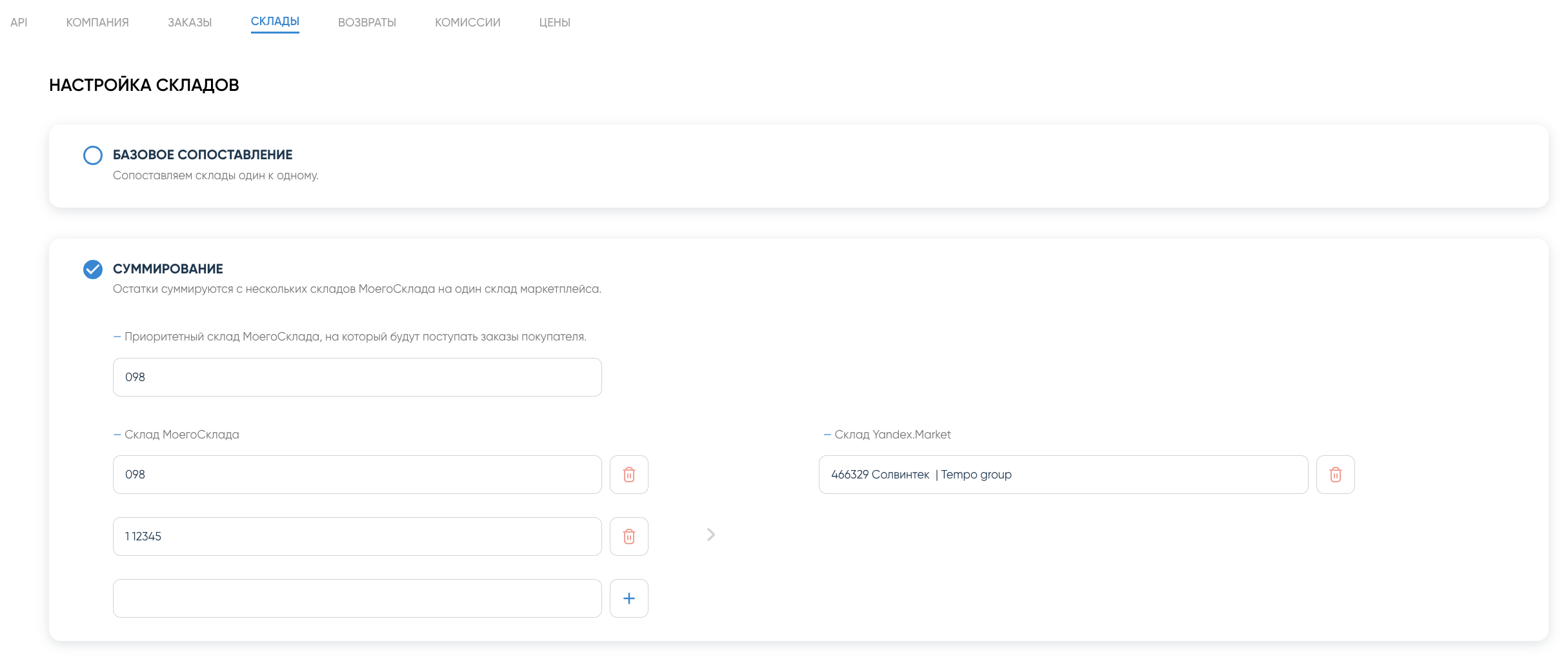 Во вкладке Склады необходимо настроить склады маркетплейса по принципу сопоставления.