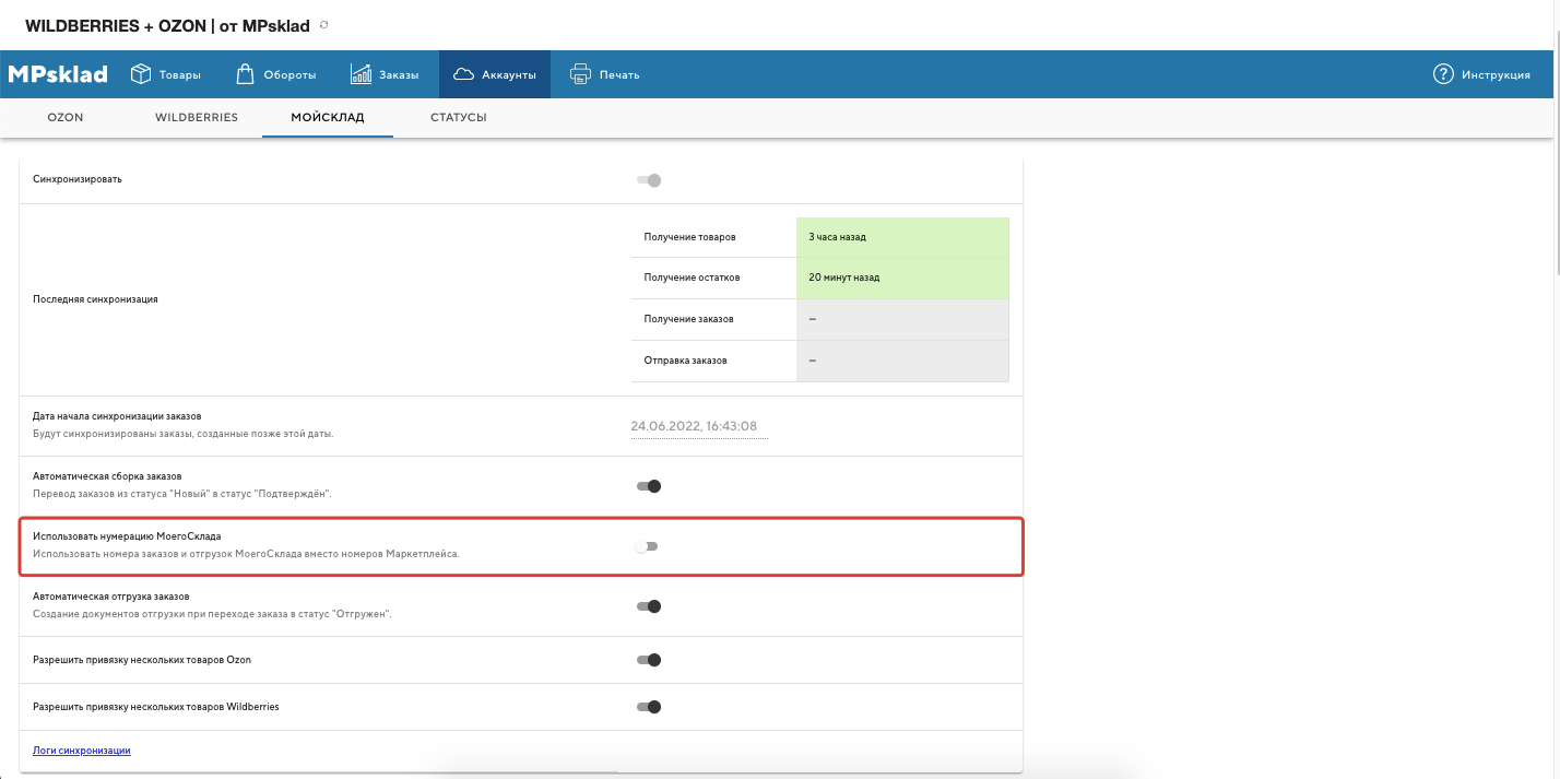 «Использовать нумерацию МоегоСклада» - актуально для пользователей, у которых помимо продаж на маркетплейсах есть еще продажи, например, в интернет магазине. При отключенном тумблере заказы из маркетплейса подтягиваются в МойСклад с собственной нумерацией, что может быть не очень удобно, если есть дополнительные продажи из интернет магазина или других каналов сбыта. Включая функцию, всем заказам, приходящим из маркетплейса, будет присваиваться нумерация МоегоСклада.