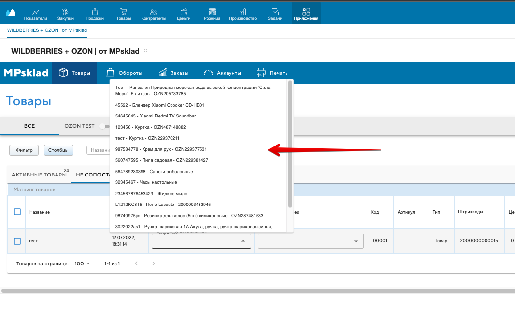 Ручной матчинг, сопоставление товаров путем поиска подходящего товара из выпадающего списка.